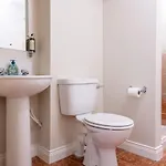 חדר אמבטיה עם אמבטיה ומקלחת גם כן מסופק עם מייבש שיער, מייבש ווילונות אמבטיה.